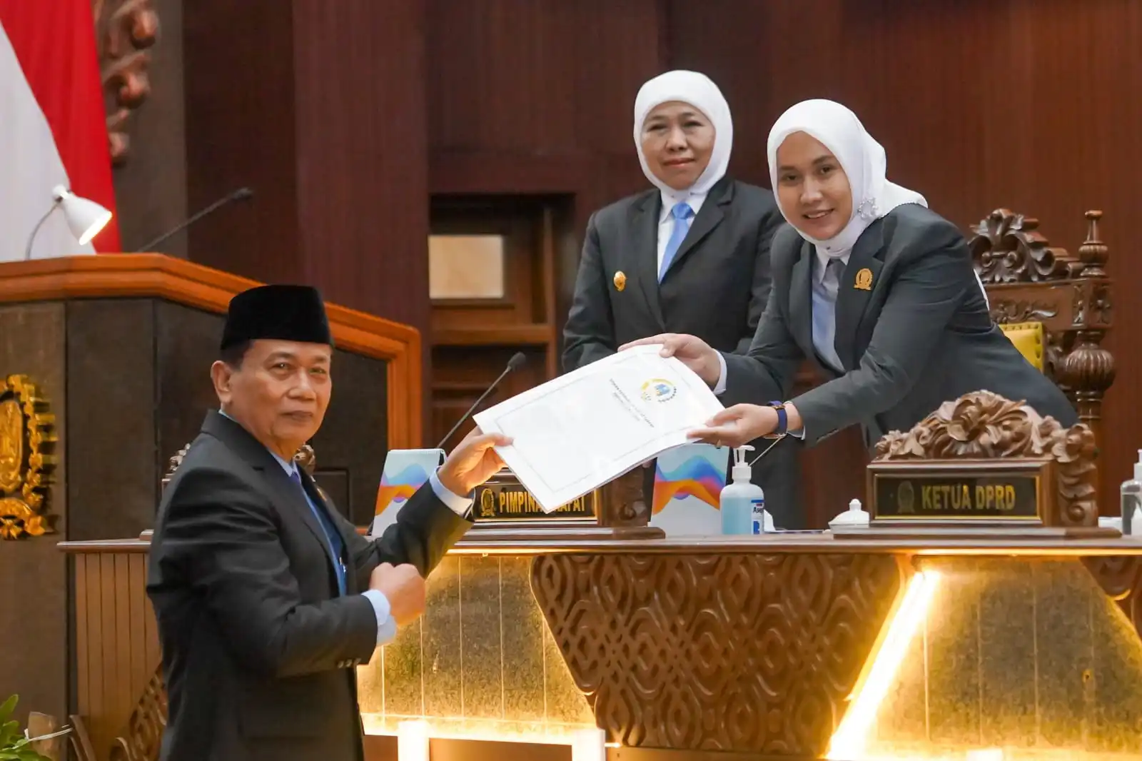 SUARAGONG.COM – Gubernur Jawa Timur Khofifah Indar Parawansa bersama Pimpinan DPRD Provinsi Jawa Timur resmi mengesahkan dua Peraturan Daerah (Perda) strategis dalam Rapat Paripurna di Gedung DPRD Jatim, Senin (19/1/2026).