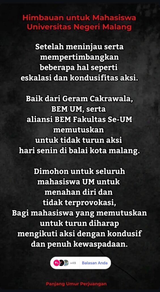 BEM Malang Raya juga menyampaikan permohonan maaf atas perubahan keputusan mendadak ini. Mereka mengajak seluruh mahasiswa tetap menjaga persatuan dan kewaspadaan, sembari menegaskan bahwa perjuangan mahasiswa tidak berhenti di jalanan.