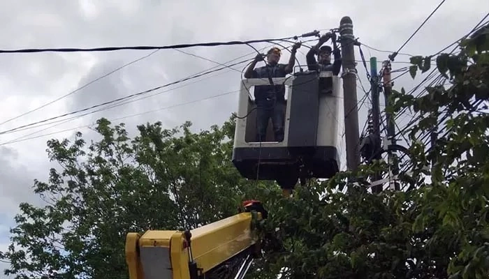 Untuk mempercepat perbaikan, Dishub menurunkan petugas dengan bantuan skywalker, alat yang memungkinkan pengerjaan jaringan di ketinggian dilakukan dengan lebih aman dan cepat.