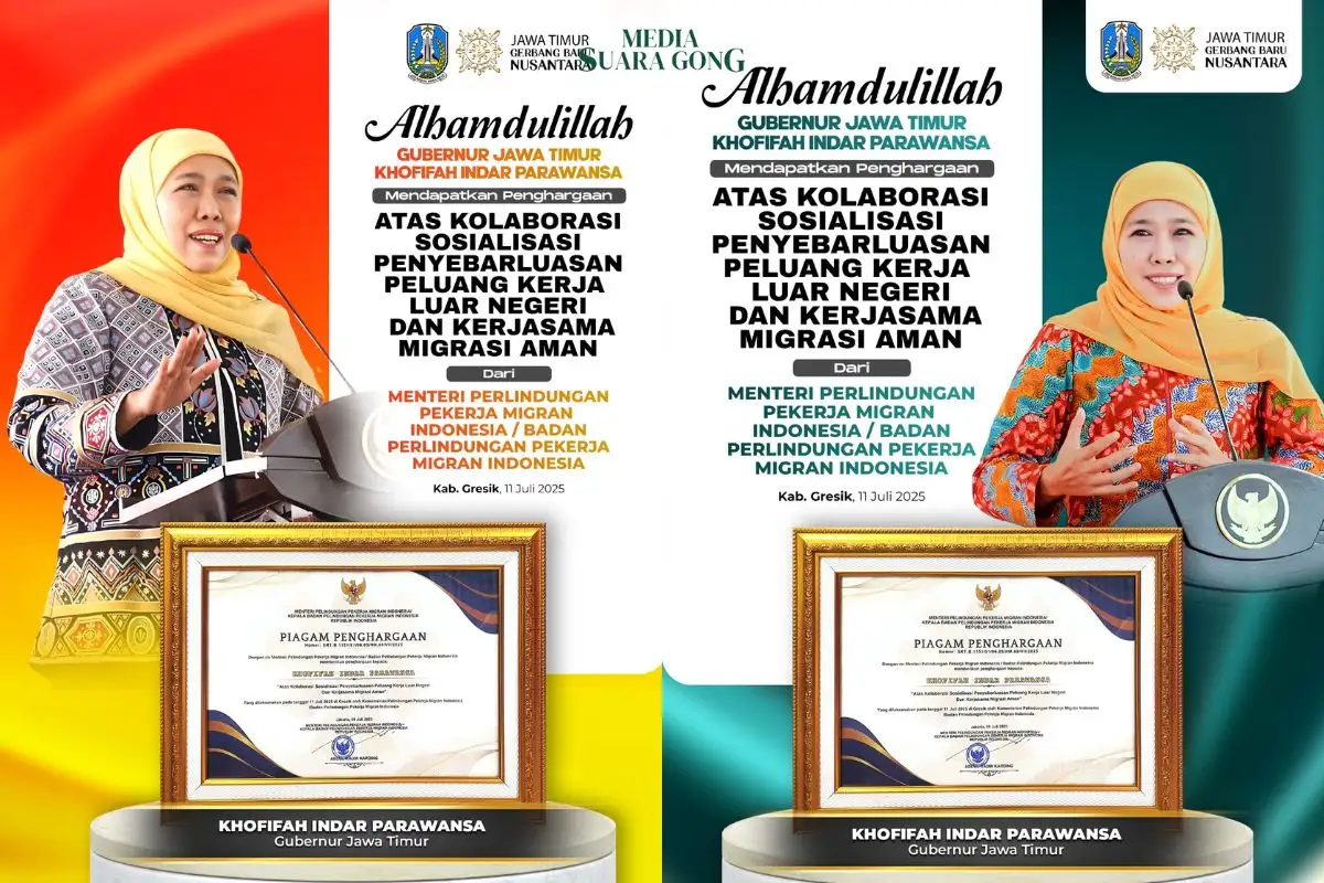 Penghargaan tersebut diserahkan langsung oleh Menteri Abdul Kadir Karding kepada Gubernur Khofifah—yang diwakili oleh Kepala Dinas Tenaga Kerja dan Transmigrasi Jatim, Sigit Priyanto—dalam acara peluncuran program Desa Migran Emas di Wahana Ekspresi Poesponegoro, Gresik, Jumat (11/7/2025).