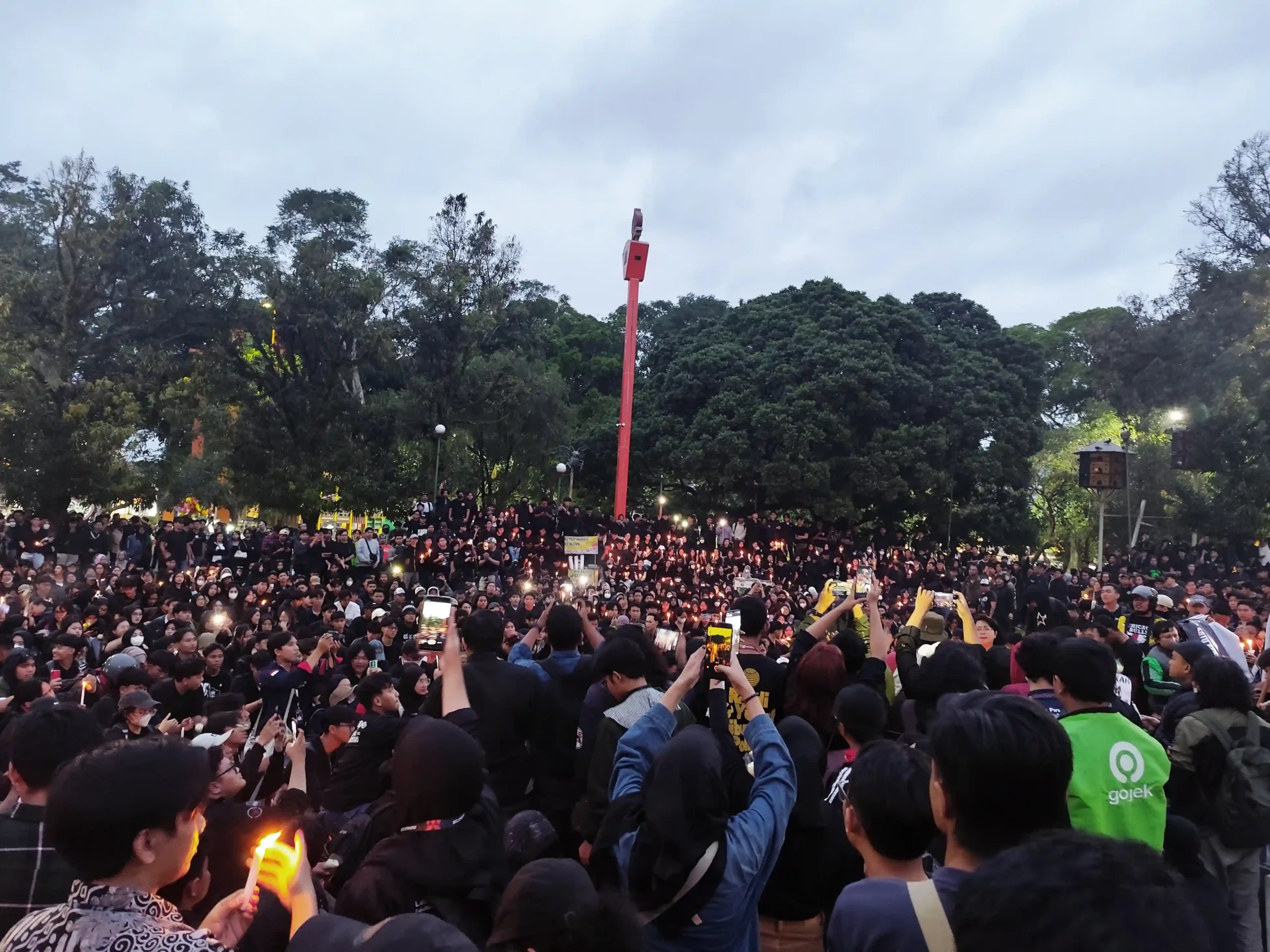 Ribuan massa dengan dress code serba hitam mulai memadati Alun-alun Merdeka Kota Malang, Jumat (29/8) sore sekitar pukul 15.30 WIB. Aksi ini diikuti berbagai elemen masyarakat, mulai dari mahasiswa, komunitas ojek online, hingga aktivis hak asasi manusia.
