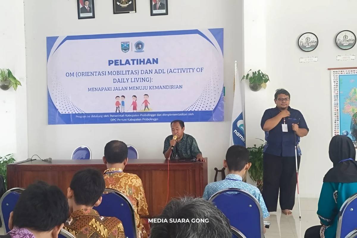 SUARAGONG.COM – Tunanetra di Kabupaten Probolinggo kini semakin percaya diri untuk menapaki jalan kemandirian. Selama dua hari, tepatnya Sabtu–Minggu (27–28/9/2025), Persatuan Tunanetra Indonesia (Pertuni) Kabupaten Probolinggo menyelenggarakan Pelatihan Tunanetra Probolinggo Mandiri berupa Orientasi Mobilitas (OM) dan Activity of Daily Living (ADL). Kegiatan ini digelar di aula SMP Namira Probolinggo dan menghadirkan suasana penuh semangat serta kebersamaan.
