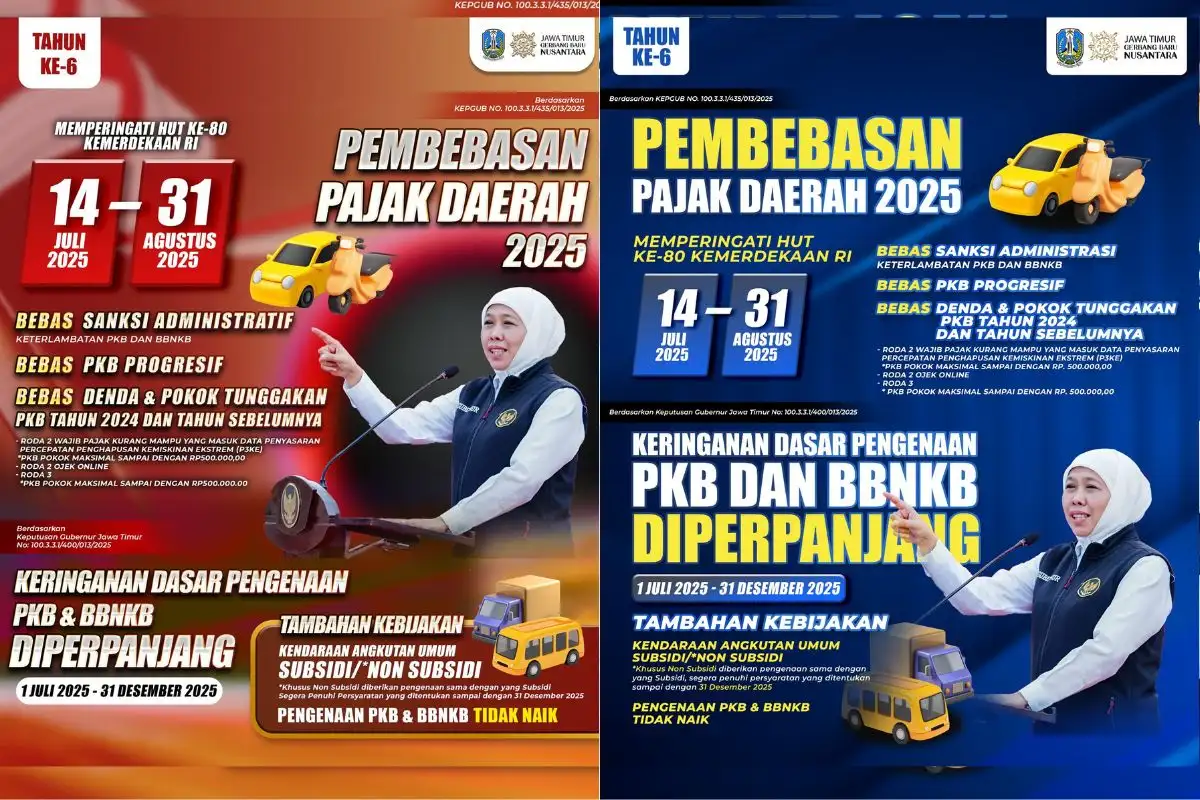 “Yang ini mulai berlaku tanggal 14 Juli hingga 31 Agustus 2025, jadi masyarakat Jawa Timur mari bisa segera memanfaatkan. Terutama bagi wajib pajak ojek online, yang masuk dalam P3KE, serta sepeda motor roda tiga pelaku usaha,” jelas Khofifah.