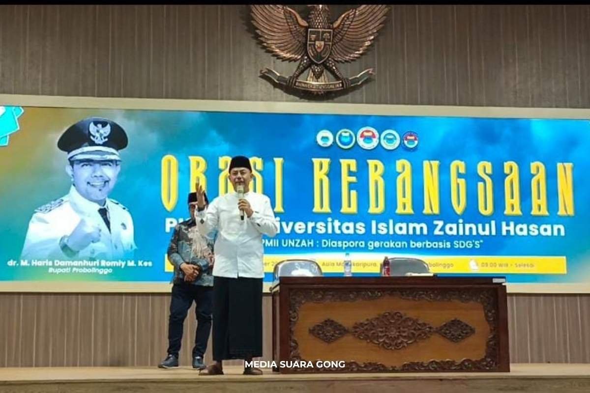 SUARAGONG.COM – Bupati Probolinggo, dr. Mohammad Haris atau akrab disapa Gus Haris, mengingatkan para mahasiswa untuk tidak melupakan akar nilai-nilai kesantrian dalam setiap langkah perjuangan mereka. Pesan moral mahasiswa santri ini ia disampaikan saat menyampaikan orasi kebangsaan dalam pelantikan raya pengurus Pergerakan Mahasiswa Islam Indonesia (PMII) Universitas Islam Zainul Hasan (Unzah) Genggong Kraksaan, yang digelar di Auditorium Madakaripura Kantor Bupati Probolinggo, Minggu (26/10/2025).