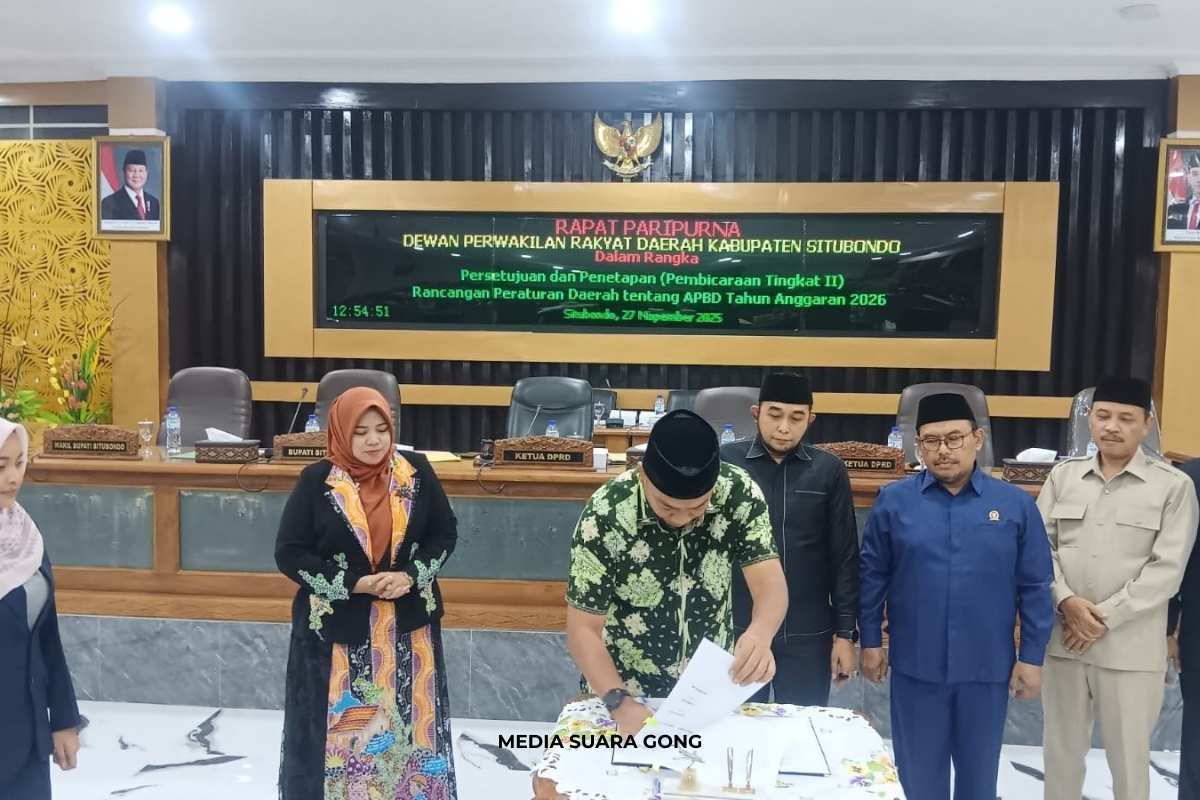 SITUBONDO, SUARAGONG.COM – Dewan Perwakilan Rakyat Daerah (DPRD) Kabupaten Situbondo baru aja ngegelar Rapat Paripurna APBD Situbondo 2026 buat nentuin persetujuan dan penetapan Raperda APBD. Acaranya digelar di ruang sidang paripurna kantor DPRD pada Kamis (27/11/2025). Agenda ini dipimpin langsung Ketua DPRD Situbondo, Mahbub Junaidi, bareng para pimpinan dan anggota DPRD. Hadir juga Bupati Situbondo Yusuf Rio Wahyu Prayogo, Wakil Bupati Ulfiyah, jajaran Forkopimda, kepala OPD, camat, sampai Direktur RSUD.