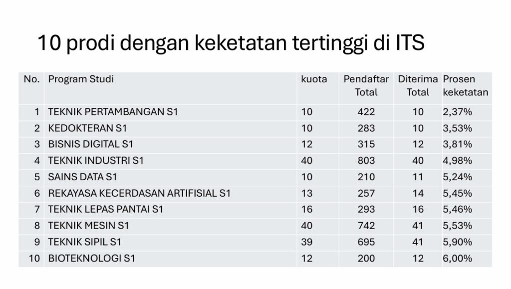 Sementara itu, prodi dengan tingkat keketatan tertinggi adalah Teknik Pertambangan, yang tergolong prodi baru.