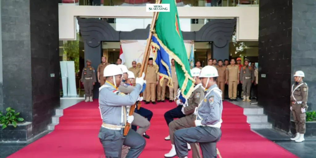SUARAGONG.COM – Plt. Bupati Lamongan, Abdul Rouf, secara resmi menerima Pataka Jer Basuki Mawa Bea…