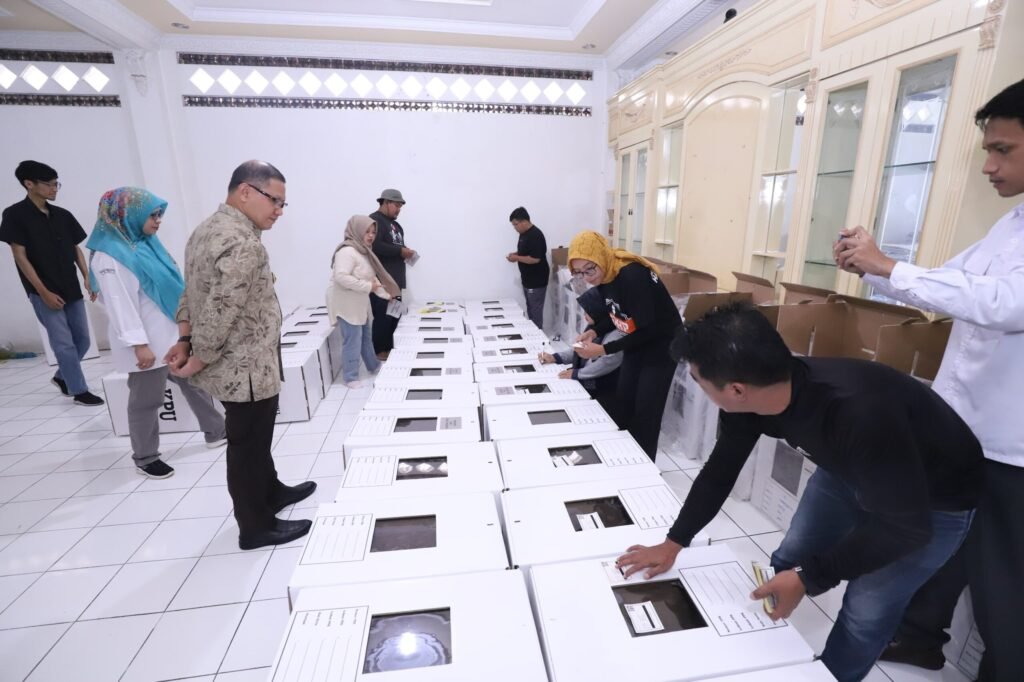 Untuk memastikan Pemilu 2024 di Kota Batu aman dan lancar, Pj. Wali Kota Batu, Aries Agung Paewai, didampingi Ketua Komisi Pemilihan Umum (KPU), Heru Joko Purwanto, mengecek logistik pemilihan suara di gudang KPU yang berada di Jalan Sultan Agung, Kota Batu, Kamis (1/2/2024).